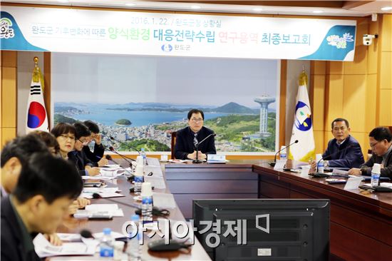 [아시아경제 노해섭 기자]완도군(군수 신우철)은 지난 22일 수산양식관련 연구기관 전문가들과 양식단체 및 어업인이 참석한 가운데 기후변화에 따른 양식환경 대응전략 수립을 위한 연구용역 최종보고회를 개최했다.