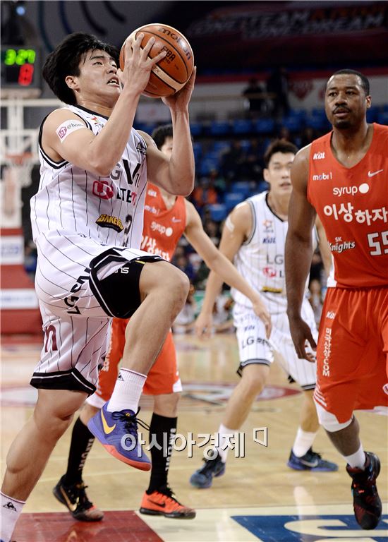 [잠실=아시아경제 김현민 기자] 프로농구 서울 SK와 창원 LG의 경기가 27일 잠실학생체육관에서 열렸다. LG 정성우가 상대 수비를 뚫고 슛하고 있다.
