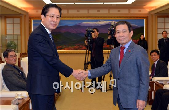 삼성전자 서병삼 부사장(생활가전사업부장, 왼쪽)이 27일 오후 시청 3층 비즈니스룸에서 윤장현 광주광역시장에게 최근 지역에서 이슈가 되고 있는 삼성전자 광주사업장의 생산라인 베트남 이전과 관련한 삼성 측의 공식입장을 설명하고 악수를 하고있다.사진제공=광주시