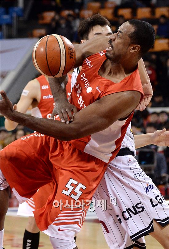 [잠실=아시아경제 김현민 기자] 프로농구 서울 SK와 창원 LG의 경기가 27일 잠실학생체육관에서 열렸다. SK 사이먼이 상대 류종현과 공을 다투고 있다.