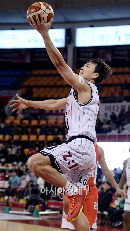 [잠실=아시아경제 김현민 기자] 프로농구 서울 SK와 창원 LG의 경기가 27일 잠실학생체육관에서 열렸다. LG 김영환이 상대 수비를 뚫고 슛하고 있다.