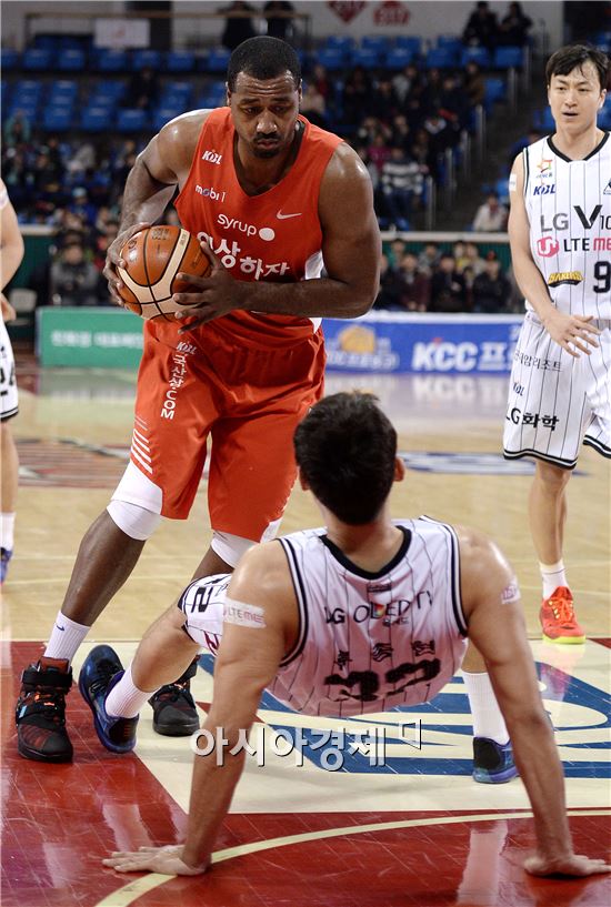 [잠실=아시아경제 김현민 기자] 프로농구 서울 SK와 창원 LG의 경기가 27일 잠실학생체육관에서 열렸다. SK 사이먼이 넘어지는 상대 류종현을 바라보고 있다.