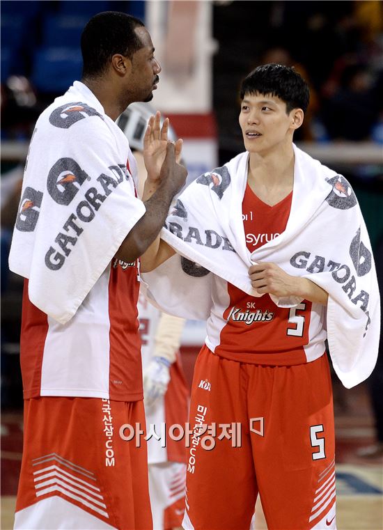 [잠실=아시아경제 김현민 기자] 프로농구 서울 SK와 창원 LG의 경기가 27일 잠실학생체육관에서 열렸다. SK 김선형이 82-73 승리를 확정한 뒤 팀 동료 사이먼과 하이파이브하고 있다.
