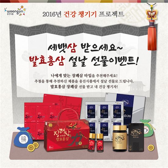 [아시아경제 이주현 기자]웅진식품은 다가오는 설 명절을 맞아 장쾌삼 추천 이벤트를 진행한다. 장쾌삼은 1976년 출시돼 40년의 역사를 갖고 있는 웅진식품의 홍삼 브랜드다.