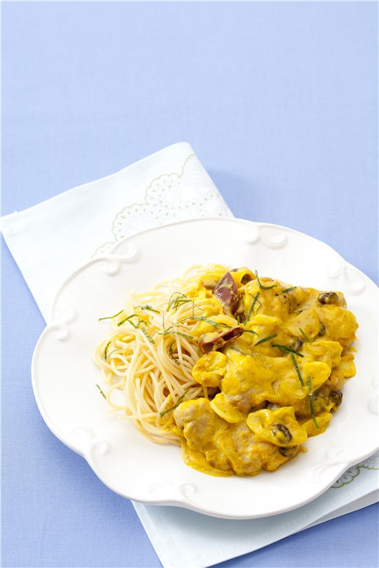 닭 다리 4개, 소금·후춧가루 약간씩, 양파 1개, 마늘 3쪽, 화이트 와인 1/2컵, 마른 고추 1/2개, 카레가루 4, 우유 1컵, 생크림 1/4컵, 건포도 2, 레몬즙 1, 우스터소스 1.5, 스파게티 100g