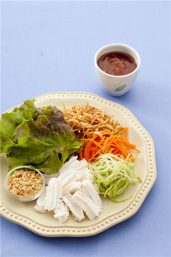 5. 그릇에 데친 오징어, 채 썬 당근, 오이를 보기 좋게 담고 상추와 만두피, 땅콩, 소스를 곁들인다.