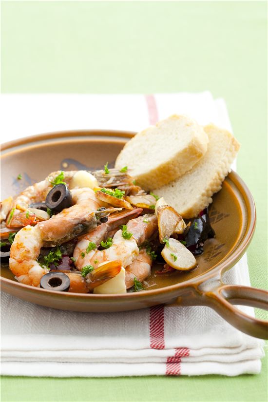 4. 매운 향이 올라오면 손질한 새우와 블랙 올리브를 넣고 뚜껑을 덮어 익혀 그릇에 담고 다진 파슬리를 뿌린 후 바게트를 곁들인다.