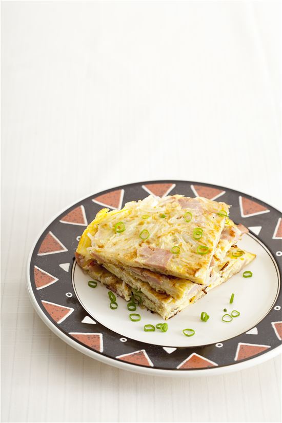 1. 달걀은 곱게 풀어 소금으로 간하고 햄은 얇게 썬다.