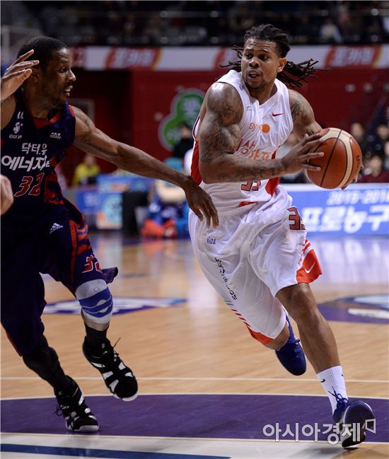 [고양=아시아경제 김현민 기자] 프로농구 고양 오리온과 서울 SK의 경기가 10일 고양체육관에서 열렸다. SK 미첼이 상대 헤인즈의 수비를 뚫고 공격하고 있다.
