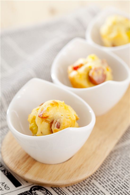 주키니 호박 50g, 양파 70g, 파프리카 50g, 옥수수(통조림) 30g, 햄 50g, 소금 적당량, 달걀 2개, 생크림 30g, 식용유 30g, 마요네즈 20g, 박력분 100g, 베이킹파우더 3g, 파마산 치즈가루 50g