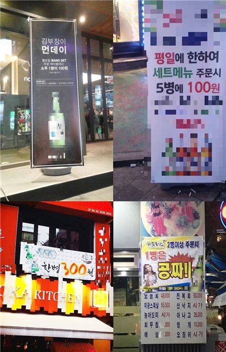 해당 상권에서는 '소주 한 병 300원 판매', '2병 주문 시 1병 공짜', '평일에 한해 세트메뉴 주문 시 5병에 100원' 등의 입간판과 현수막을 곳곳에서 쉽게 볼 수 있었다.