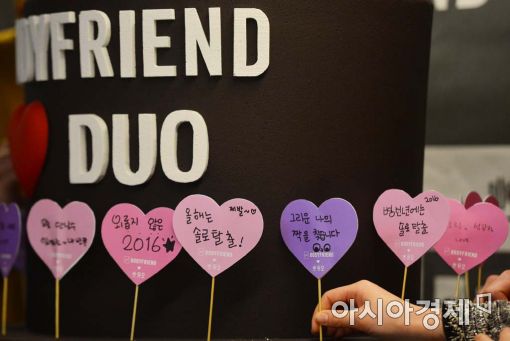 [아시아경제 백소아 기자] 14일 서울 강남구 바디프랜드 도곡타워에서 열린 밸런타인데이 기념 미팅파티에서 참가자들이 1.8m 대형 초콜릿케이크에 솔로탈출 염원의 메시지를 꽂고 있다.