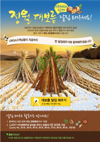 올가 인터넷 쇼핑몰에서는 ‘행복기원 이벤트’를 진행한다. 정월대보름마다 액막이와 풍년기원을 위해 볏으로 된 달집을 태우던 옛 풍습을 재현한 이벤트로 참여 고객에게는 매일 200 포인트를 지급한다. 또 럭키 넘버(2016, 3016, 4016, 5016, 6016, 7016, 8016, 9016, 10016)에 달집을 태운 고객에게는 26일에 5000 포인트를 지급한다.