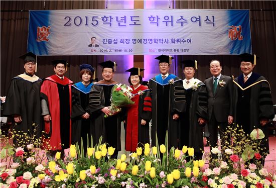 16일 열린 한세대학교 2015학년도 전기 학위수여식에서 참석자들이 기념촬영을 하고 있다. 왼쪽부터 윤현철 한세대 학생인재개발처장, 신문철 교목실장, 백진아 입학홍보처장, 진중섭 ㈜금강TECH 회장, 김성혜 한세대 총장, 김윤주 군포시장, 허순범 삼신다이아몬드 회장, 워터스 배경석 회장, 이상선 한세대 대학원장.