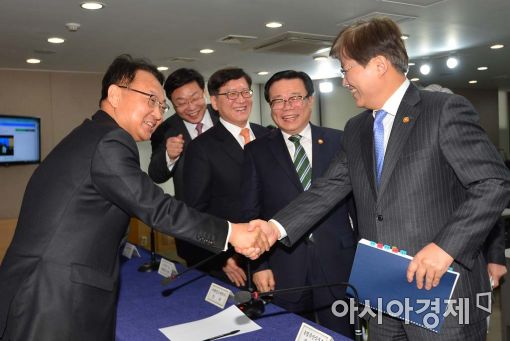 [아시아경제 백소아 기자] 17일 서울 세종로 정부서울청사에서 유일호 경제부총리(맨 왼쪽)과 최양희 미래창조과학부 장관(맨 오른쪽)이 무역투자진흥회의 투자 활성화 대책을 발표한 후 악수를 하고 있다. 이날 유 부총리는 "민간 투자와 신산업 발전, 수출 동력 창출을 막는 규제를 과감히 걷어내 2018년까지 약 50조 이상의 민간 투자와 일자리 블루 오션을 개척하겠다"고 말했다.