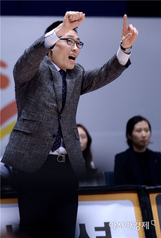 [인천=아시아경제 김현민 기자] 여자프로농구 신한은행과 KB국민은행의 경기가 17일 인천 도원체육관에서 열렸다. 신한은행 전형수 감독이 선수들을 독려하고 있다.