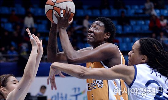 [인천=아시아경제 김현민 기자] 여자프로농구 신한은행과 KB국민은행의 경기가 17일 인천 도원체육관에서 열렸다. 국민은행 하워드가 상대 커리의 거친 수비에 깜짝 놀라고 있다.