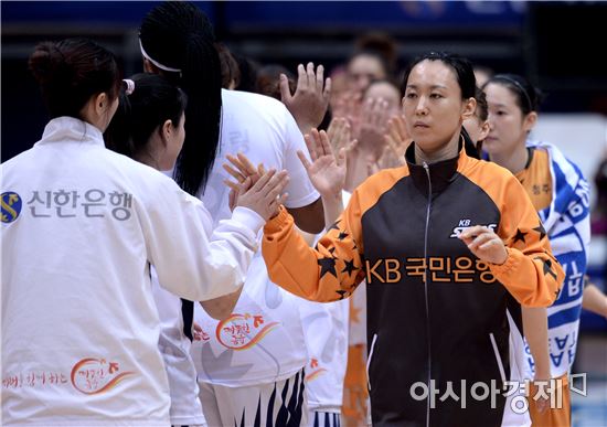 [인천=아시아경제 김현민 기자] 여자프로농구 신한은행과 KB국민은행의 경기가 17일 인천 도원체육관에서 열렸다. 국민은행 변연하가 팀의 103-79 승리를 확정한 뒤 상대 선수들과 인사하고 있다.