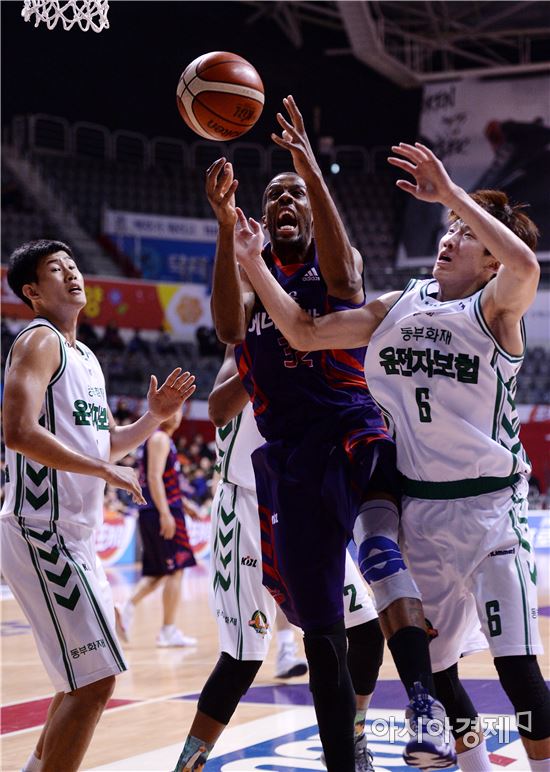 [고양=아시아경제 김현민 기자] 프로농구 고양 오리온과 원주 동부의 경기가 18일 고양체육관에서 열렸다. 오리온 헤인즈가 상대 두경민과 리바운드를 다투고 있다.