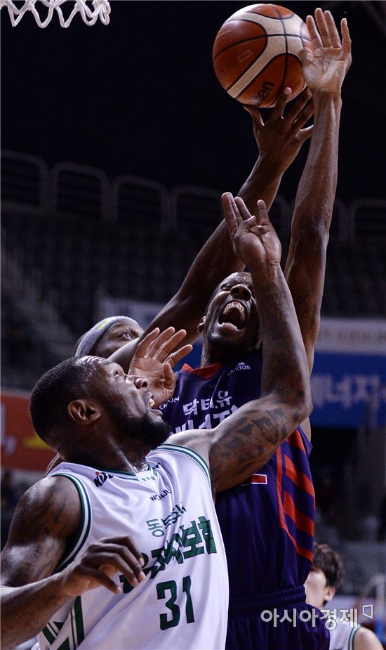 [고양=아시아경제 김현민 기자] 프로농구 고양 오리온과 원주 동부의 경기가 18일 고양체육관에서 열렸다. 오리온 헤인즈가 상대 맥키네스·벤슨과 리바운드를 다투고 있다.