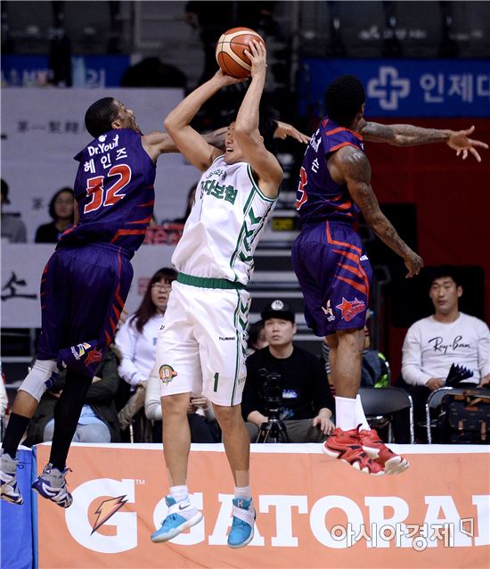[고양=아시아경제 김현민 기자] 프로농구 고양 오리온과 원주 동부의 경기가 18일 고양체육관에서 열렸다. 동부 한정원이 오리온 헤인즈·조 잭슨의 수비에 막혀 슛을 포기하고 있다.