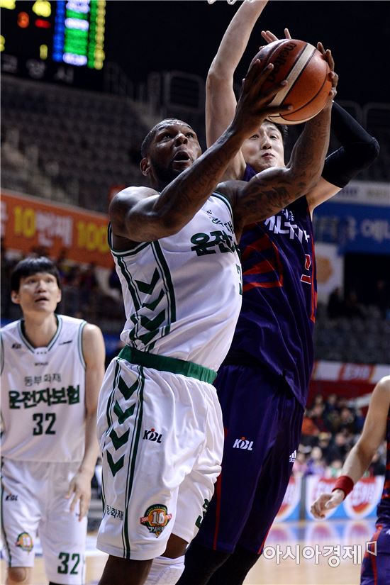 [고양=아시아경제 김현민 기자] 프로농구 고양 오리온과 원주 동부의 경기가 18일 고양체육관에서 열렸다. 동부 맥키네스가 상대 김진수의 수비를 뚫고 공격하고 있다.