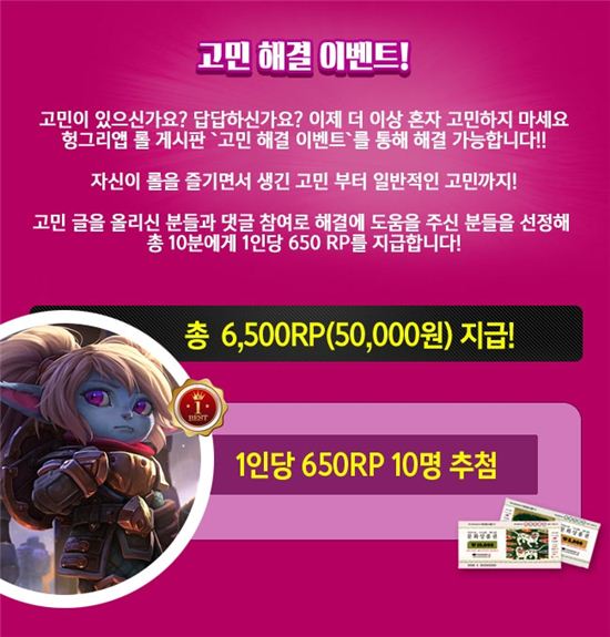 이번 이벤트는 ‘고민 해결 이벤트!'로 '리그오브레전드 헝그리앱' 커뮤니티에 이벤트 기간 동안 게임 또는 개인적인 자신의 고민을 작성하거나 타인이 작성한 고민 글에 대해 댓글을 작성하면 추첨을 통해 총 6500RP를 지급한다. 본 이벤트는 3월2일까지 진행되며 자세한 내용은 '리그오브레전드 헝그리앱' 커뮤니티 이벤트 공지를 통해 확인할 수 있다.