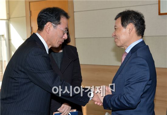 윤장현 광주광역시장(오른쪽)은 25일 오전 시청 3층 접견실에서 이.취임 인사차 시청을 방문한 현 사와다 켄지 대표이사와 신임 강동완 대표이사를 접견하고 이야기를 나누고 있다.한국알프스(주)는 자동차 및 Home Mobile 관련 전자부품을 제조하는 기업으로 신임 강동완 대표이사는 한국알프스(주) 창립 30년 이래 광주지역 출신 최초 한국인 대표이사로 취임할 예정이다.
