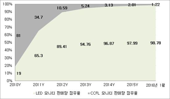 삼성전자와 LG전자 주요 모니터 제조사가 지난 2011년부터 CCFL모니터를 출시하지 않은 것도 주요 원인으로 분석된다. CCFL모니터는 현재 산업용 제품을 제외하고 새로 출시되는 제품이 연간 2~3종에 불과해 머지 않아 시장에서 사라질 것으로 전망된다.