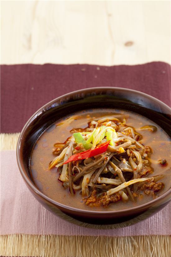 3. 냄비에 고추기름을 두르고 양념한 쇠고기를 넣어 볶다가 느타리버섯, 고사리, 대파도 넣고 잘 볶아준 다음 물 7컵을 넣고 숙주를 넣어 끓인다.