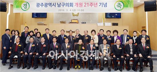 [포토]광주시 남구의회 개원 21주년 기념식 광주 남구의회 본회의장에서 4일 열린 ‘남구의회 개원 21주년 기념식’에서 김점기 남구의회 의장을 비롯한 서용 의정회장, 전ㆍ현직 의원들이 기념촬영을 하고 있다. 사진제공=광주시 남구