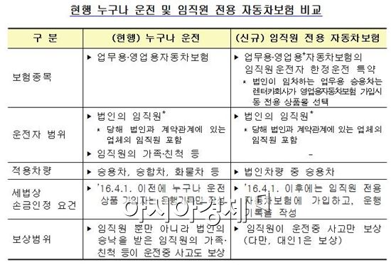 아울러 법인의 임직원이 운전 중 발생한 사고에 한해서만 보상을 받을 수 있게 된다. 또 임직원 전용 자동차 보험에 가입하면 운전범위가 제한되는 대신 보험료는 현행 업무용과 영업용 자동차 보험에 비해 0.7% 싸진다. 금감원 관계자는 "임직원 전용 자동차보험 가입시 소비자 유의사항을 안내하고 불완전판매 방지 방안 등을 마련할 예정"이라고 말했다.