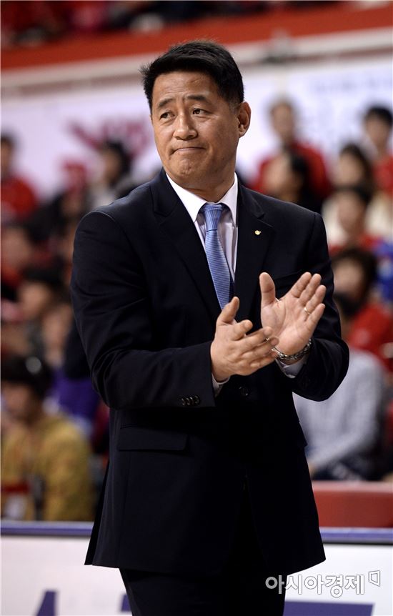 [울산=아시아경제 김현민 기자] 2015~2016 프로농구 4강 플레이오프 울산 모비스와 고양 오리온의 경기가 8일 울산 동천체육관에서 열렸다. 오리온 추일승 감독이 박수를 치고 있다.