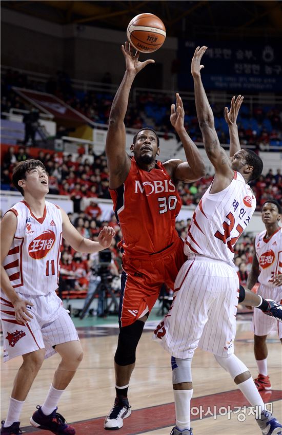 [울산=아시아경제 김현민 기자] 2015~2016 프로농구 4강 플레이오프 울산 모비스와 고양 오리온의 경기가 8일 울산 동천체육관에서 열렸다. 모비스 빅터가 상대 수비를 뚫고 공격하고 있다.