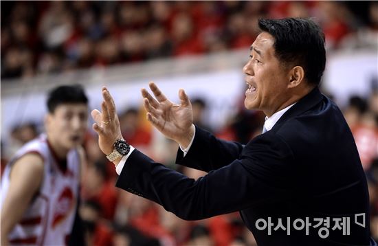 [울산=아시아경제 김현민 기자] 2015~2016 프로농구 4강 플레이오프 울산 모비스와 고양 오리온의 경기가 8일 울산 동천체육관에서 열렸다. 오리온 추일승 감독이 선수들을 독려하고 있다.