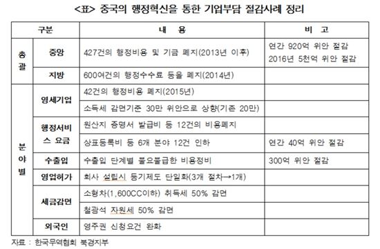 13일 한국무역협회 베이징지부가 내놓은 '중국 정부, 행정혁신을 통해 기업부담 줄인다'라는 보고서에 따르면, 중국 정부는 2013년 이후 2015년 말까지 중앙부처 차원에서 총 427건의 행정비용과 정부기금을 폐지(잠정 중지 포함)해 기업의 부담을 연간 920억 위안 줄인 것으로 집계됐다. 2016년에는 세제개혁, 정부기금 취소, 18개의 수수료 면제를 통해 총 5000억 위안(약 90조원) 이상의 기업 부담을 덜겠다고 밝혔다.