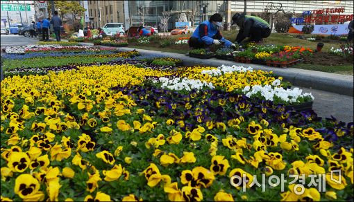 [아시아경제 윤동주 기자] 새 봄을 맞아 16일 서울 청계광장에서 환경미화원들이 봄 꽃을 심고 있다.
