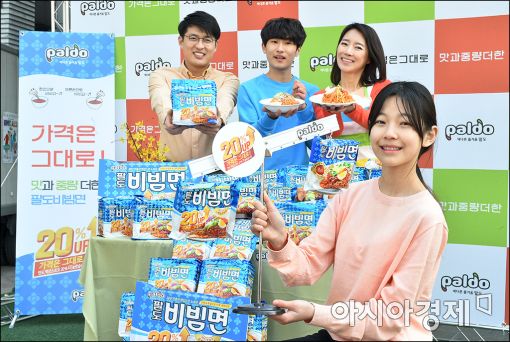 [아시아경제 윤동주 기자] 팔도비빔면 누적 판매 10억개 돌파를 기념해 16일 서울 청계광장에서 '팔도비빔면 1.2' 출시 기념 퍼포먼스를 갖고 있다. '팔도비빔면 1.2는 기존 제품대비 중량이 약 20%가량 늘리고, 가격 인상이 없는것이 특징이다.