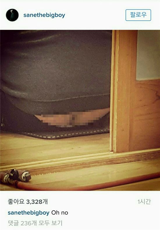 산이는 17일 자신의 인스타그램과 페이스북에 "Oh no"라는 글과 한 장의 사진을 게재했다.