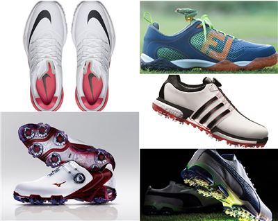 골프용품 메이커의 골프화 시장 선점 경쟁이 뜨겁다. 왼쪽 위부터 시계방향으로 나이키 루나 컨트롤 4, 풋조이 F.R.O.G.S, 아디다스 투어360 보아 부스트, 푸마 타이탄투어 이그나이트, 미즈노 제넴 G1.
