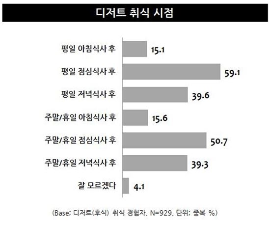 응답자의 59.1%(중복응답)가 평일 점심식사 후 디저트를 먹는다고 답했으며 이어 주말 및 휴일 점심식사 후(50.7%), 평일 저녁식사 후(39.6%), 주말 및 휴일 저녁식사 후(39.3%) 순이었다.