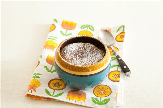 다크커버처 초콜릿 50g, 우유 1/4컵, 달걀노른자 2개, 설탕 25g, 박력분 20g, 옥수수가루 10g, 달걀 흰자 4개분, 설탕 40g, 슈가파우더 약간