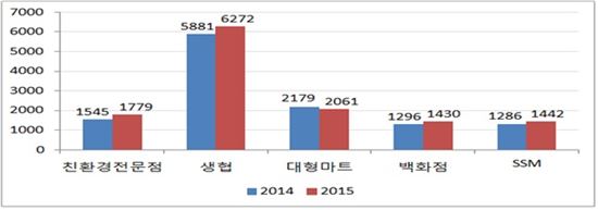 28일 농림축산식품부가 농식품신유통연구원을 통해 2015년 친환경농식품 소매판매 현황을 조사한 결과 친환경농식품 판매장은 전년보다 7.7% 늘어난 5366개, 판매액은 7.5% 늘어난 1조 3,500억원으로 집계됐다.