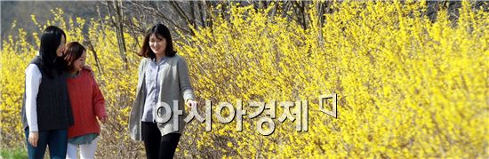[포토]봄마중하는 샛노란 개나리 봄기운이 완연한 가운데 30일 전남 함평군 함평읍 함평천변에 개나리가 만개했다. 나들이 나온 여인들이 샛노란 개나리를 보면서 봄을 만끽하고있다. 사진제공=함평군