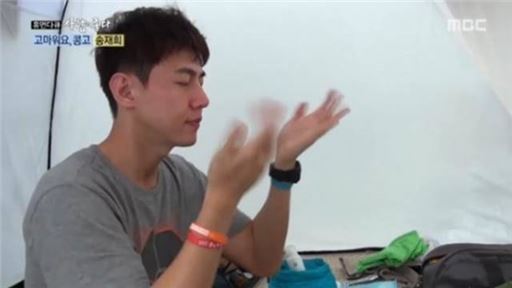 당시 송재희는 텐트 속에서 자고 일어나 물티슈를 찾았다.