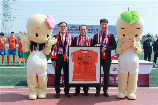 신세계사이먼은 2일 시흥시청에서 김윤식 시흥시장, 윤태학 시흥시의회 의장, 조욱희 시흥시민축구단 대표, 끼께 리네로 시흥시민축구단 감독, 조병하 신세계사이먼 대표 등이 참석하는 가운데 교류협력 협정식을 가졌다.