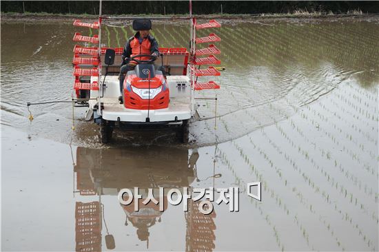 [아시아경제 노해섭 기자]보성군 율어면에서 올해 첫 모내기가 6일 율어리 자모마을 앞들에서 이뤄졌다.