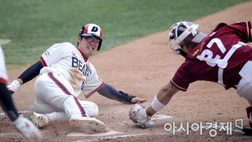[잠실=아시아경제 김현민 기자] 프로야구 넥센 히어로즈와 두산 베어스의 2016 KBO리그 경기가 10일 서울 잠실구장에서 열렸다. 4회말 2사 만루에서 두산 정수빈의 유격수 내야안타 때 2루주자 김재호가 홈으로 쇄도해 득점하고 있다.