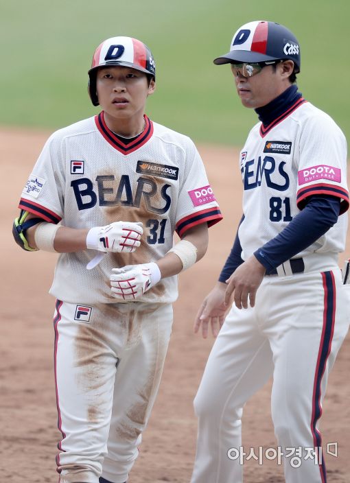 [잠실=아시아경제 김현민 기자] 프로야구 넥센 히어로즈와 두산 베어스의 2016 KBO리그 경기가 10일 서울 잠실구장에서 열렸다. 4회말 2사 만루에서 두산 정수빈이 추가 2타점 유격수 내야 안타를 치고 출루하고 있다.
