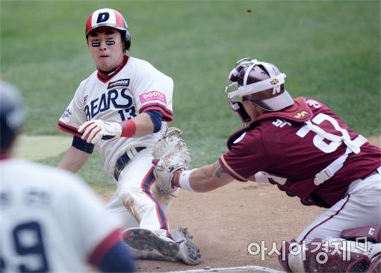 [잠실=아시아경제 김현민 기자] 프로야구 넥센 히어로즈와 두산 베어스의 2016 KBO리그 경기가 10일 서울 잠실구장에서 열렸다. 6회말 2사 2루에서 두산 정수빈의 좌전 안타 때 홈으로 쇄도한 2루주자 허경민이 넥센 박동원 포수에 태그아웃되고 있다.
